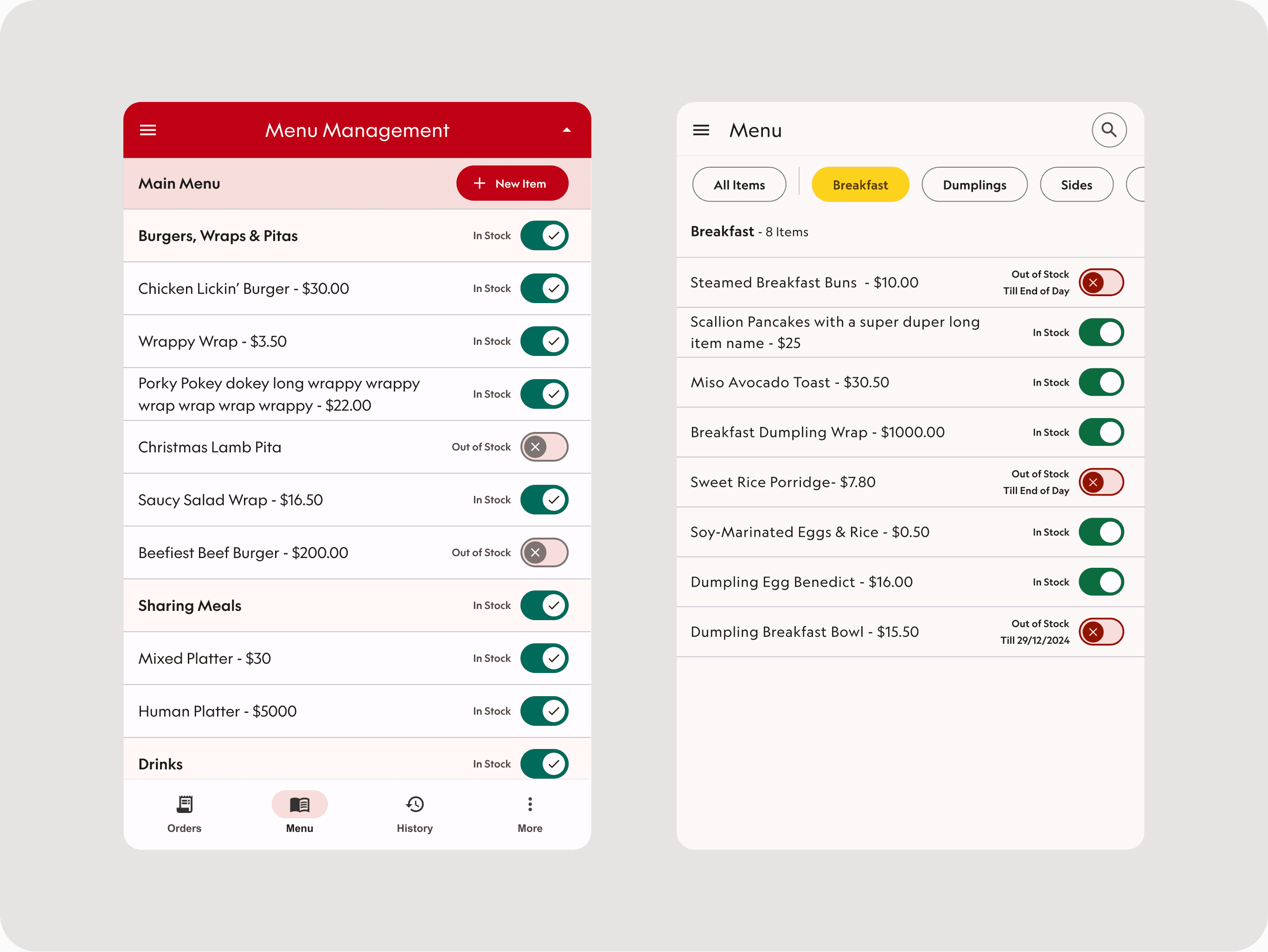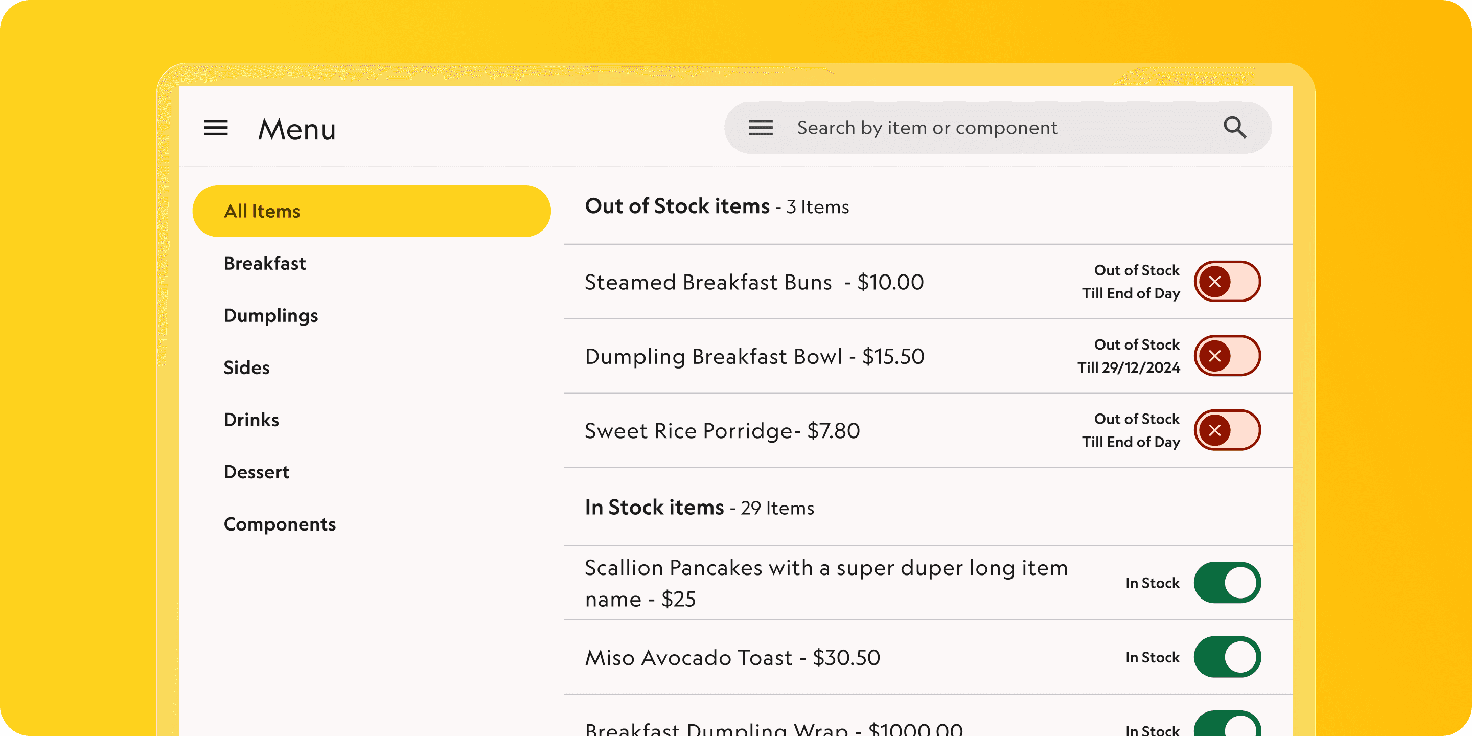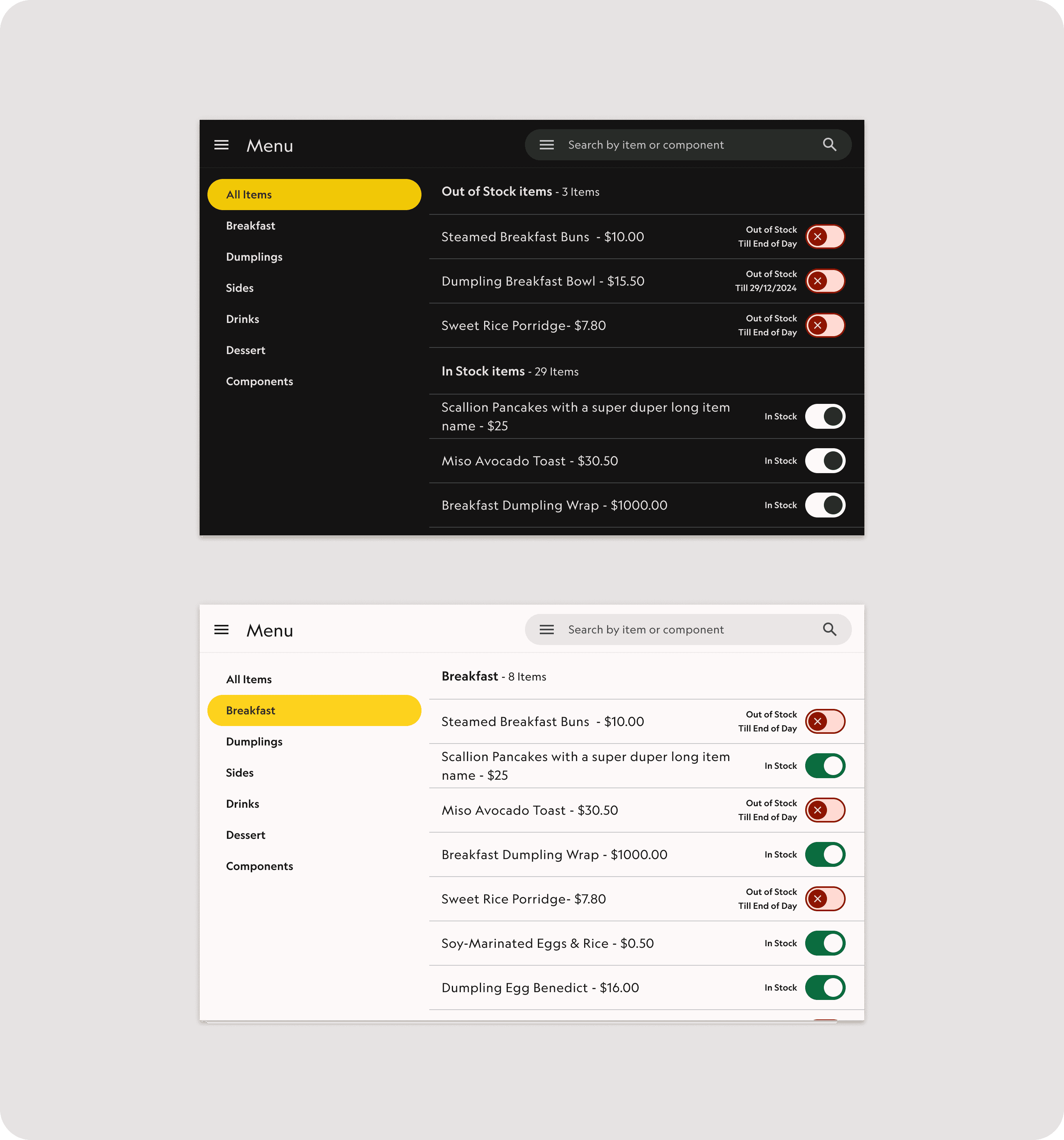 At the same time, menus were becoming more complex, with multiple menus, nested categories, and shared components. The existing “out of stock” behaviour treated inventory as a simple on/off toggle, which didn’t reflect how kitchens actually operate and led to unpredictable menu states.